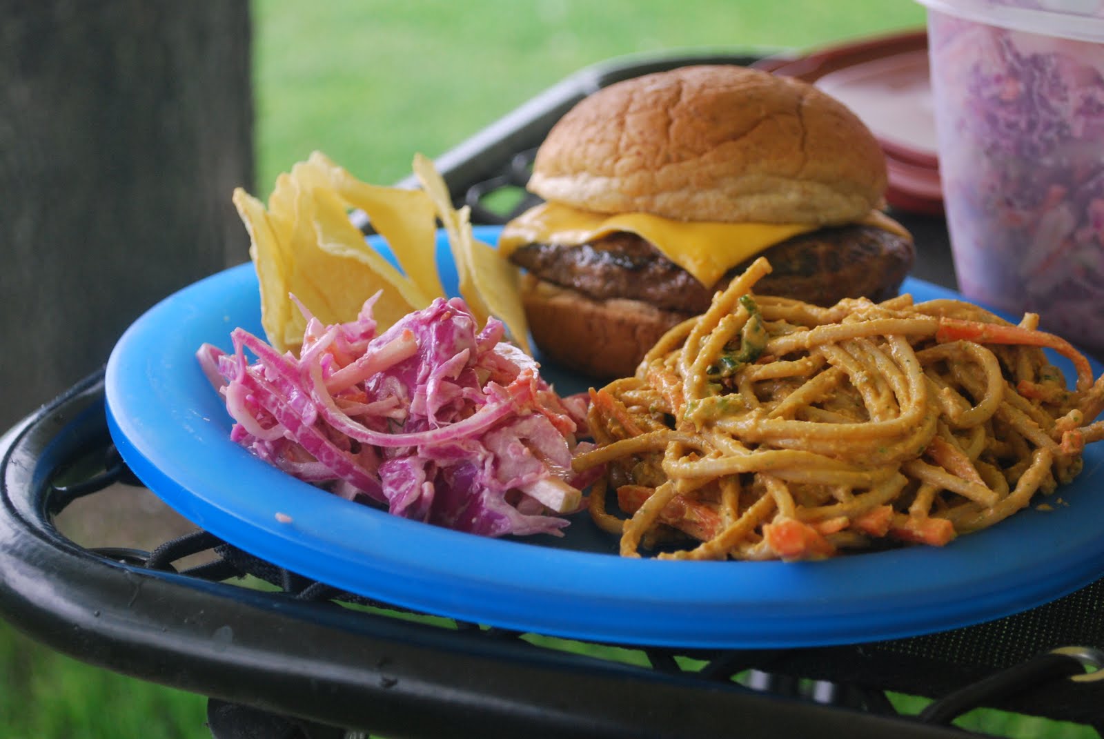 | A lovely camping meal - cheeseburgers, chips, coleslaw, and this awesome pasta salad! |