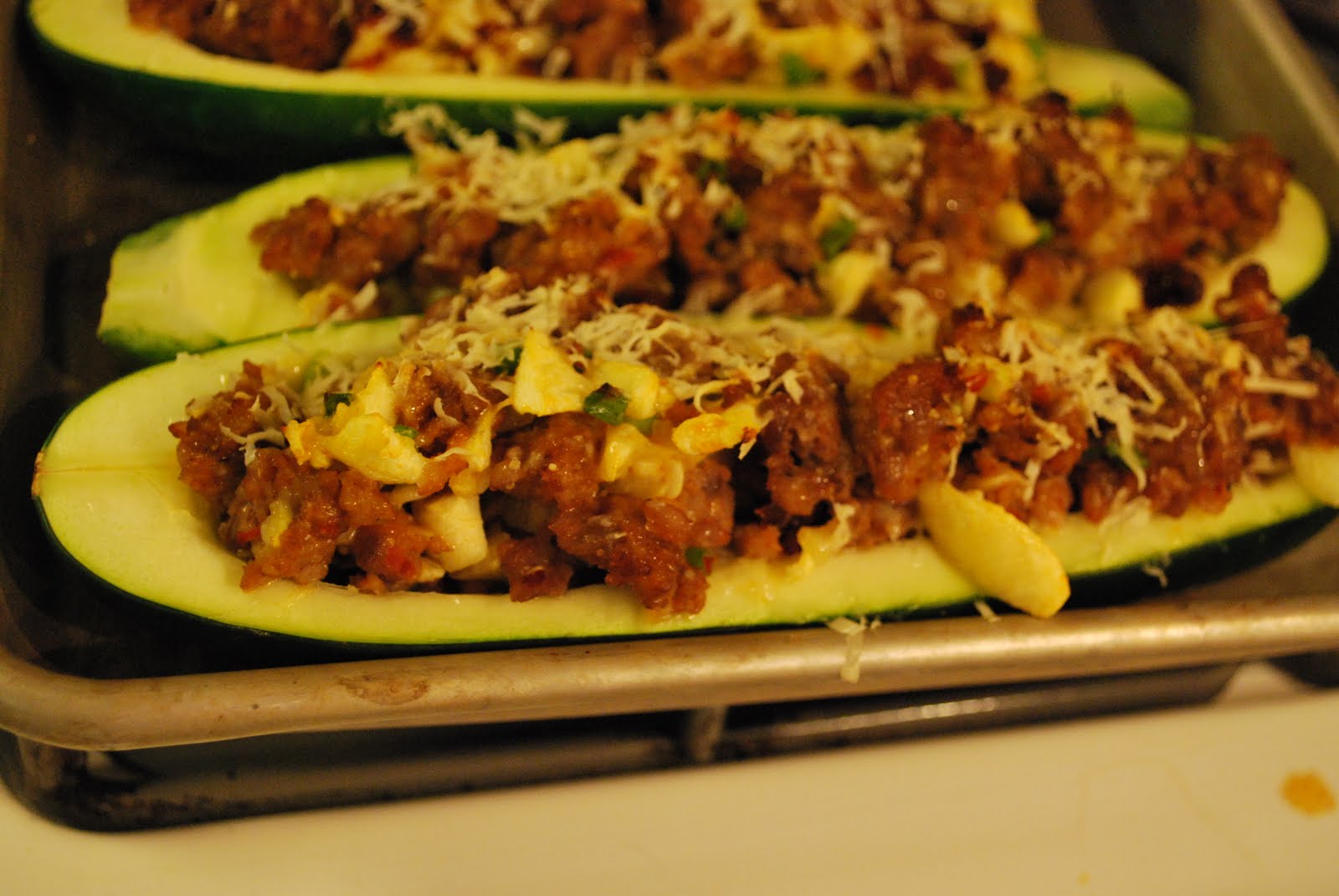Brown the sausage in a large skillet. Drain grease and combine with remaining ingredients. I had reserved the scooped out zucchini and mixed it in at this point.